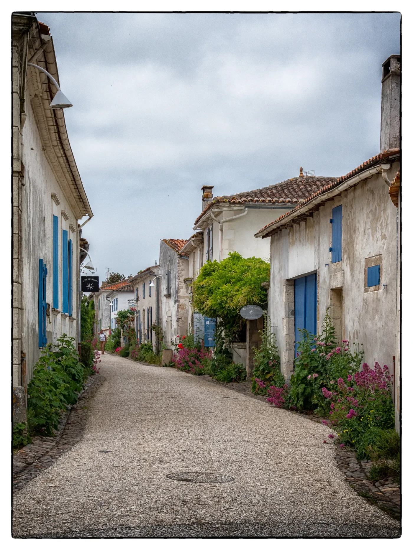 White stone houses and hollyhocks